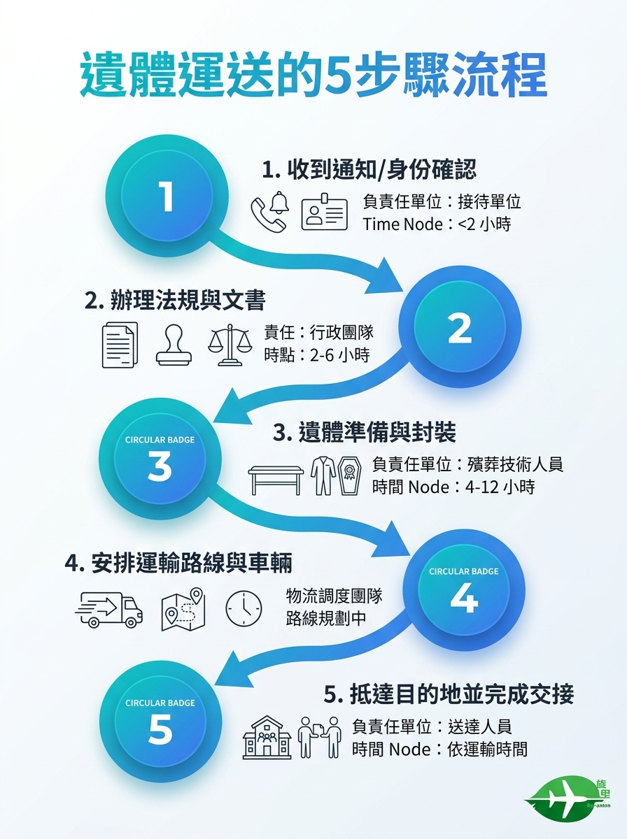 本圖展示遺體運送的五步驟流程,便於快速理解各階段要點。注意在運輸與交接過程中的法定與道德要求。